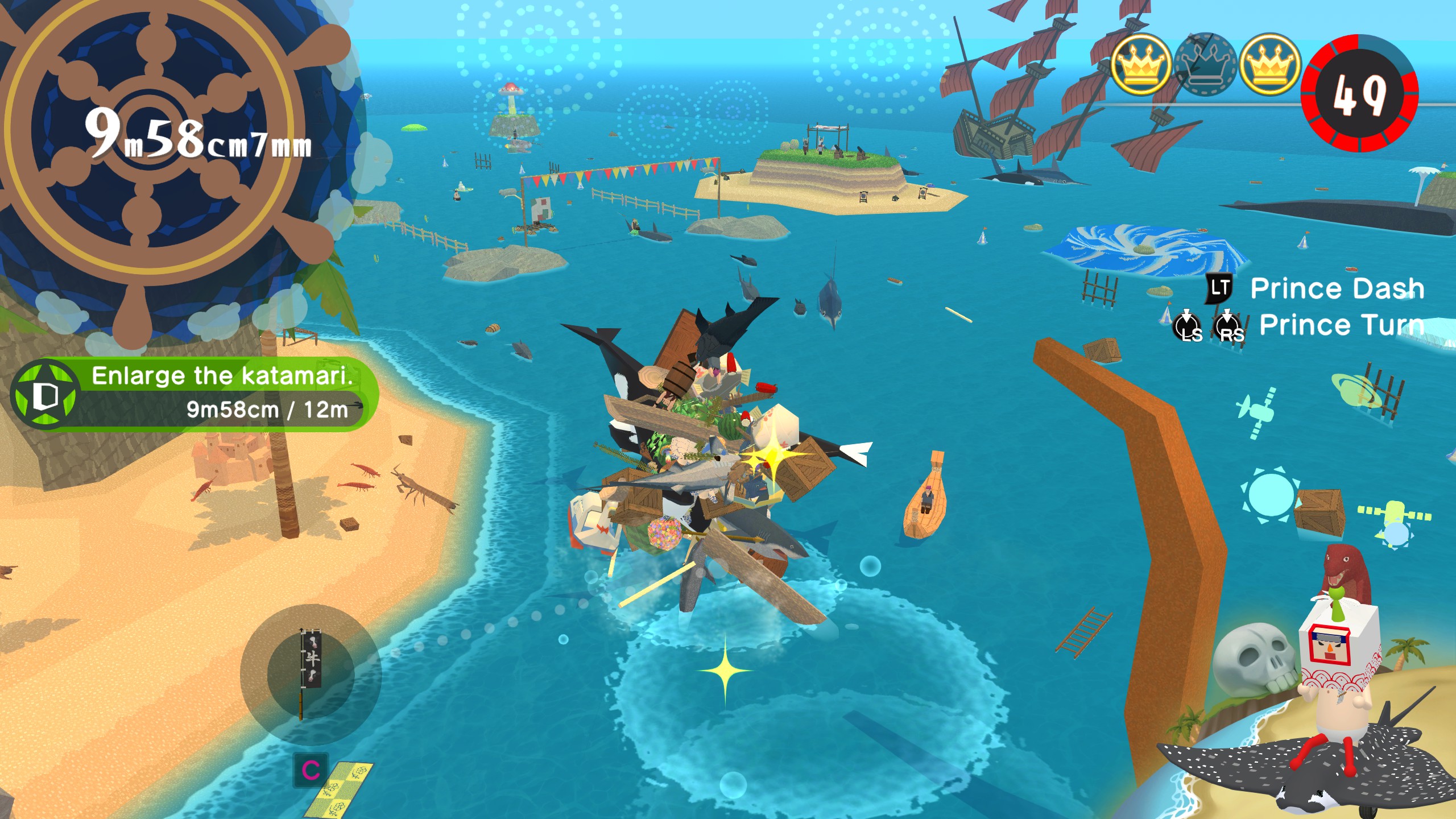 Po úspěšném splnění úkolu ale můžete zbývající čas využít ke zlepšení hodnocení až do magického písmene S. Kromě toho každá úroveň skrývá tři koruny, balíček s kosmetickým předmětem a nějaké ty bratrance k vysvobození. Kromě titulního prince totiž můžete hrát i za nespočet bratranců různých tvarů i velikostí nebo si vytvořit svého vlastního z posbíraných částí, a dokonce si ho pojmenovat.